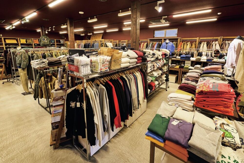 1階フロアもすごいんです。1階はレザー以外のアイテムを主に扱う。アウターやフライト、デニム、カットソーなど、アメカジの主要ブランドを多く取り揃えている。1日いても楽しめるお店なのだ。