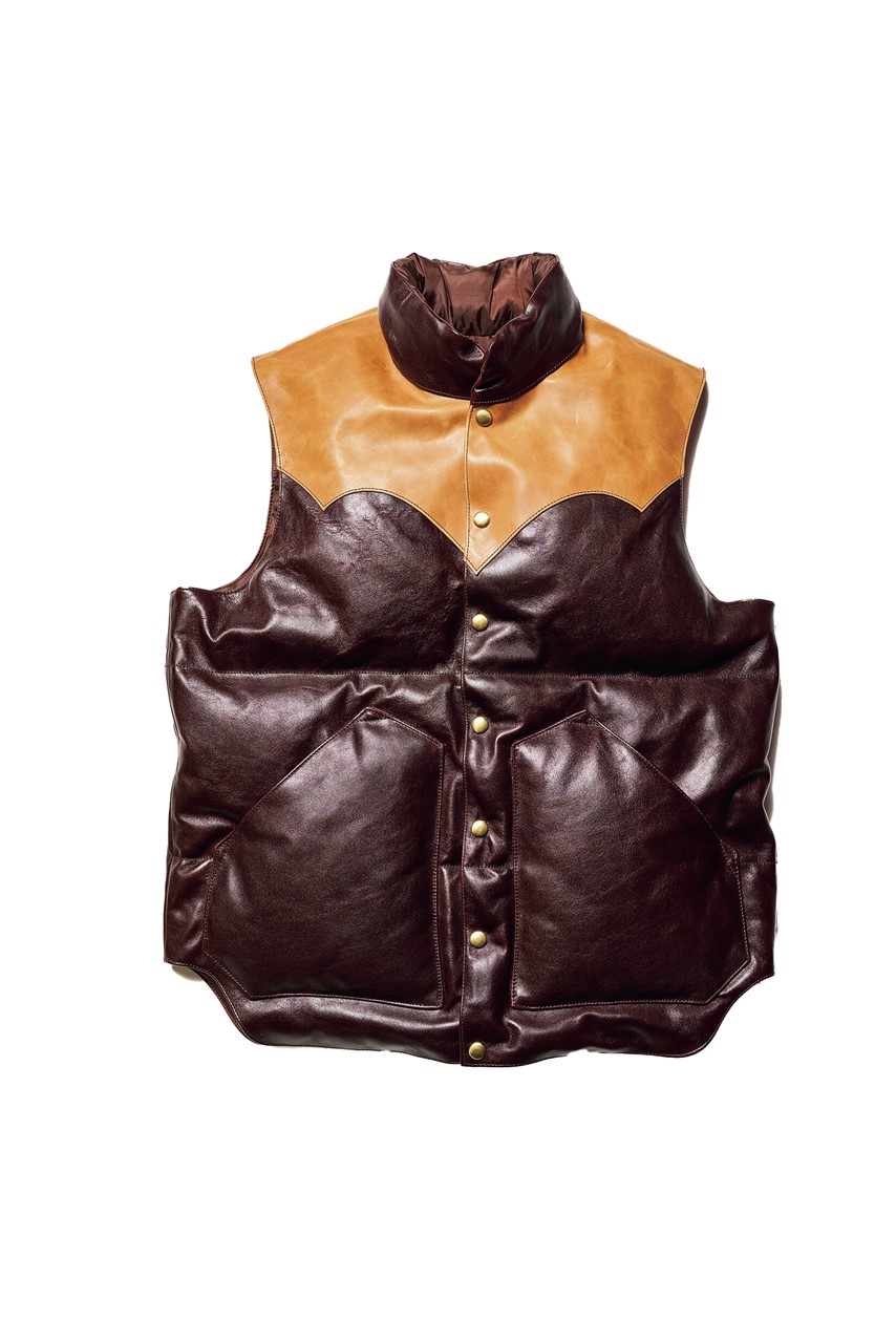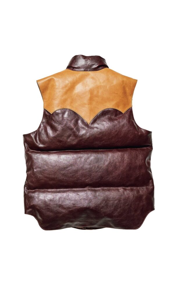 ホースハイドを採用した贅沢なレザーダウンベスト。ウエスタンヨークがデザインのアクセントになっている。天然ダウンを採用し、防寒性も高い。真冬には革ジャンの上から羽織るのもおすすめだ。13万2000円〜