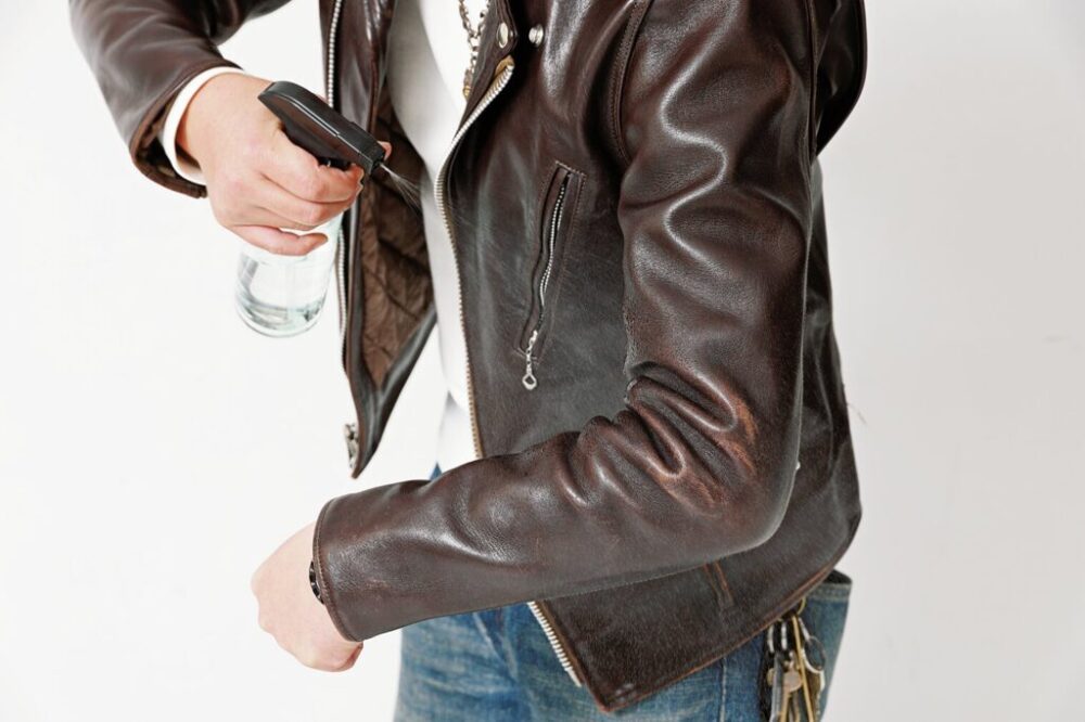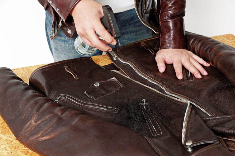 ここでおすすめなのが、ちょっと水を吹き掛けて皺をつけるというワザ。水を吹き掛けることで皺が付きやすくなり、一旦付いた皺は、消えることはない。昔はシャワーで革ジャンに水をかけよう! みたいな記事を俺も書いたことがあるが、失敗するリスクもあるので、最近は推奨していない。で、皆さんにおすすめしたいのが霧吹き。早速手順を説明しよう。