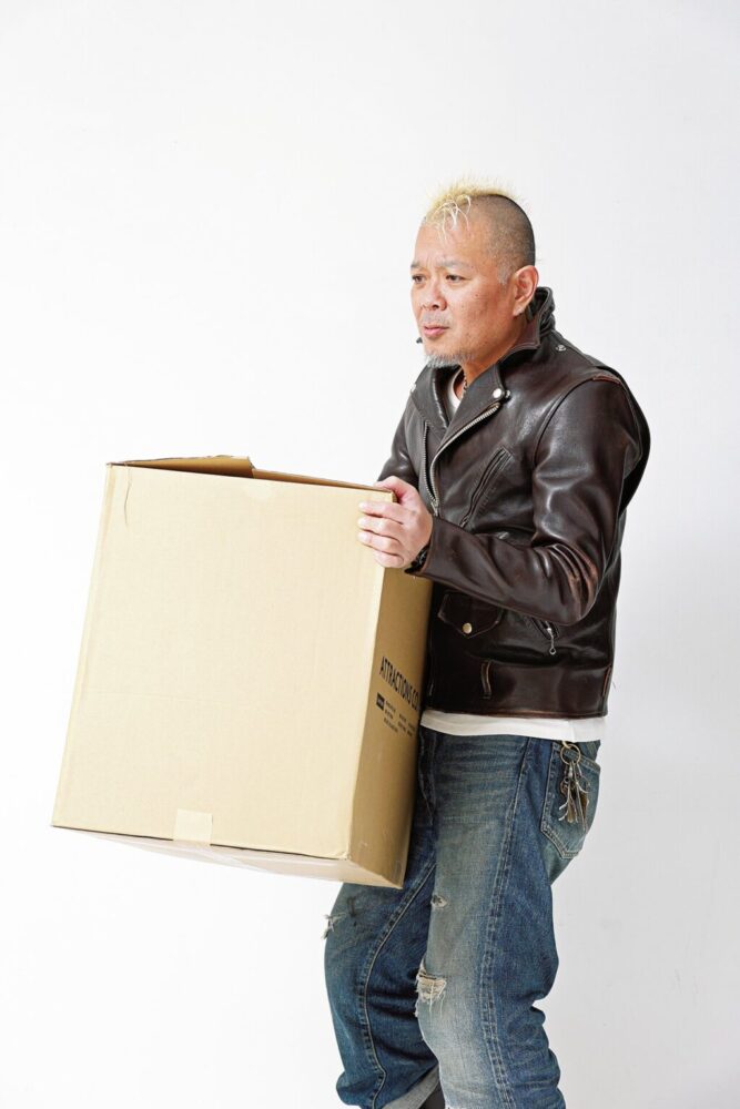 例えば荷物を運ぶ時、お掃除の時、部屋の模様替えの時などなど……大きな荷物を運ぶ時は、是非とも革ジャンを着て行っていただきたい。その際は革ジャンのフロントは是非締めてほしい。荷物が革ジャンと擦れて、良いアタリが出るチャンスだ。