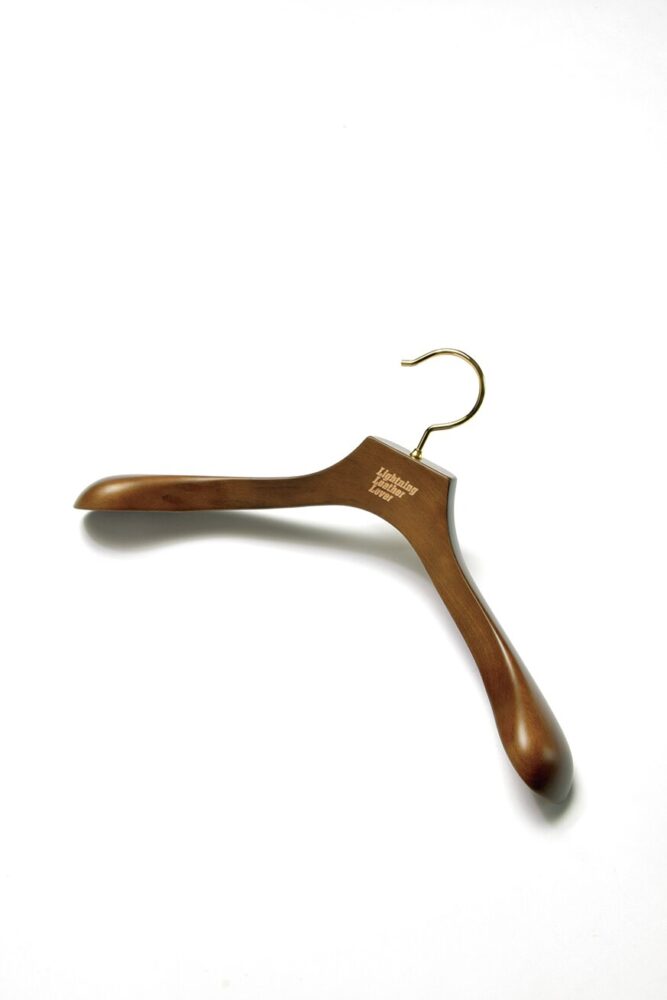 こちらが私モヒカン小川が愛用しているナカタハンガー×Lightningのレザーラバーハンガー。木から削り出して作っており、まるで工芸品のよう。