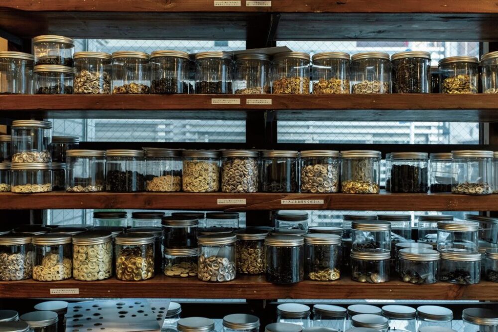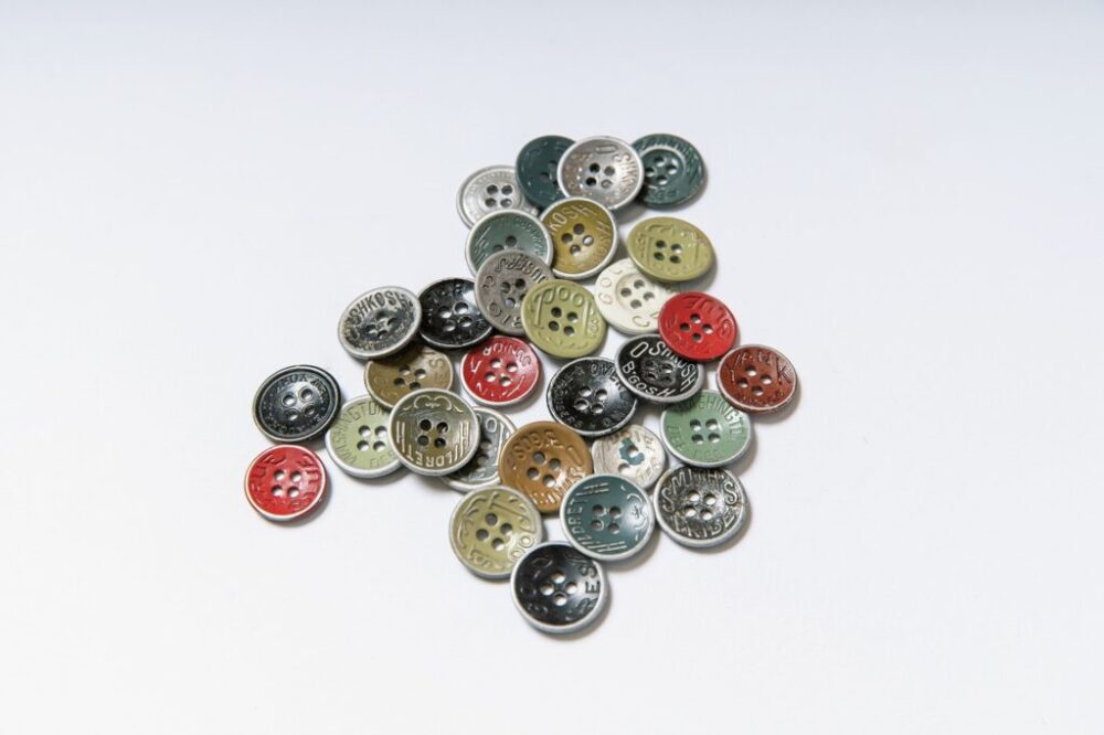 「弊社で作ったオリジナルの安価なボタンはセット、ヴィンテージなどの希少なボタンはひとつから販売しています。サンプルとして買い集めたものも多く、ここまでパーツが揃っているのは珍しいと思いますね。生地の状態にもよりますが、トップボタンやリベット類を打ち込むことも可能なので、ご相談ください」