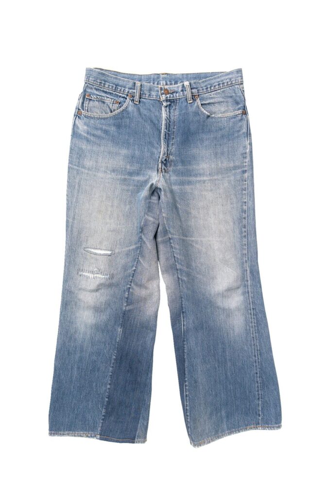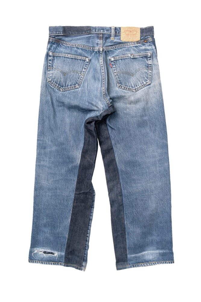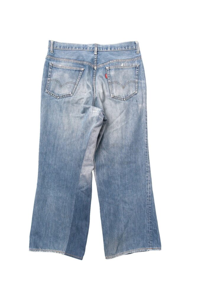サイズアウトしてしまった517の66モデルをバギーブーツカットシルエットにモディファイした力作。アウトシームはそのままに、インシームを解き、デニム生地を足すことで、バギーシルエットに変更。もともとのブーツカットのシルエットも活かしている。