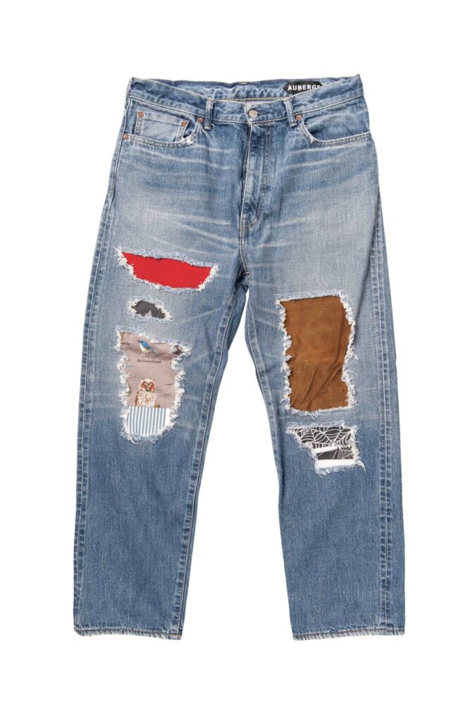 オーベルジュの加工デニムは、今シーズンにリリースされたスペシャルアイテム。カート・コバーンが愛用していたデニムからインスパイアされたリペアを施している。オリジナルは上から叩いているが、酷似した生地を裏から当てることで強度を高めた仕様にしている。8万5800円