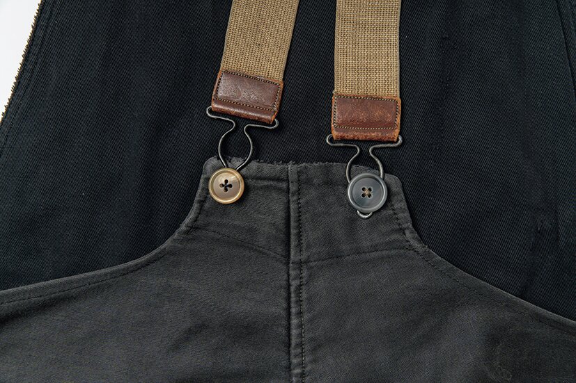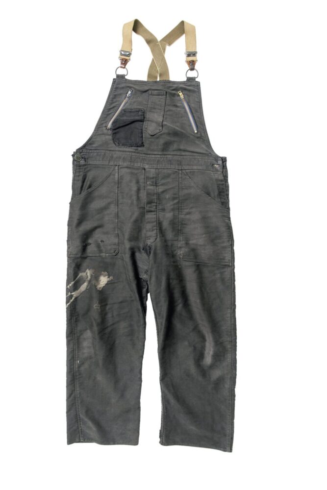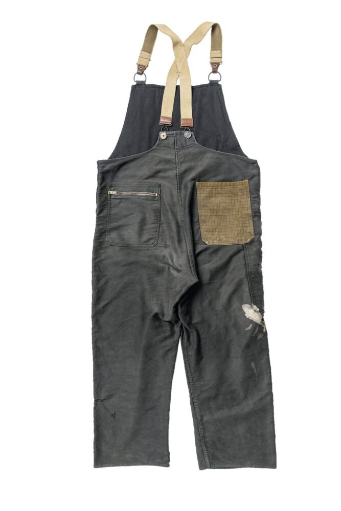 フランスのモールスキンを用いたオーバーオールは、朽ちる美しさを体現したようなエイジング。フロントとバックのポケットが取れてしまったので、ヴィンテージの生地を使った再構築。まるで当時にリペアされたような雰囲気に仕上げている。