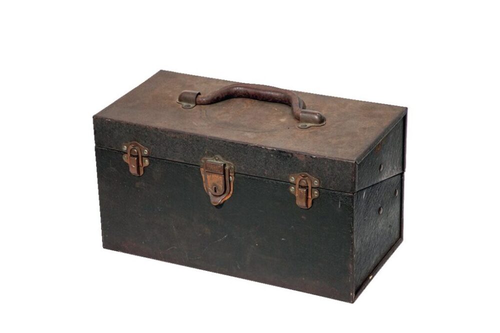 箱はメタル製。高さ6インチ、長さ12インチ、幅6インチと小ぶりなサイズで内部には5つの仕切りを備えたトップトレイが2つ付く。1920年代製ながら保管状態も抜群の備品。2万6000円