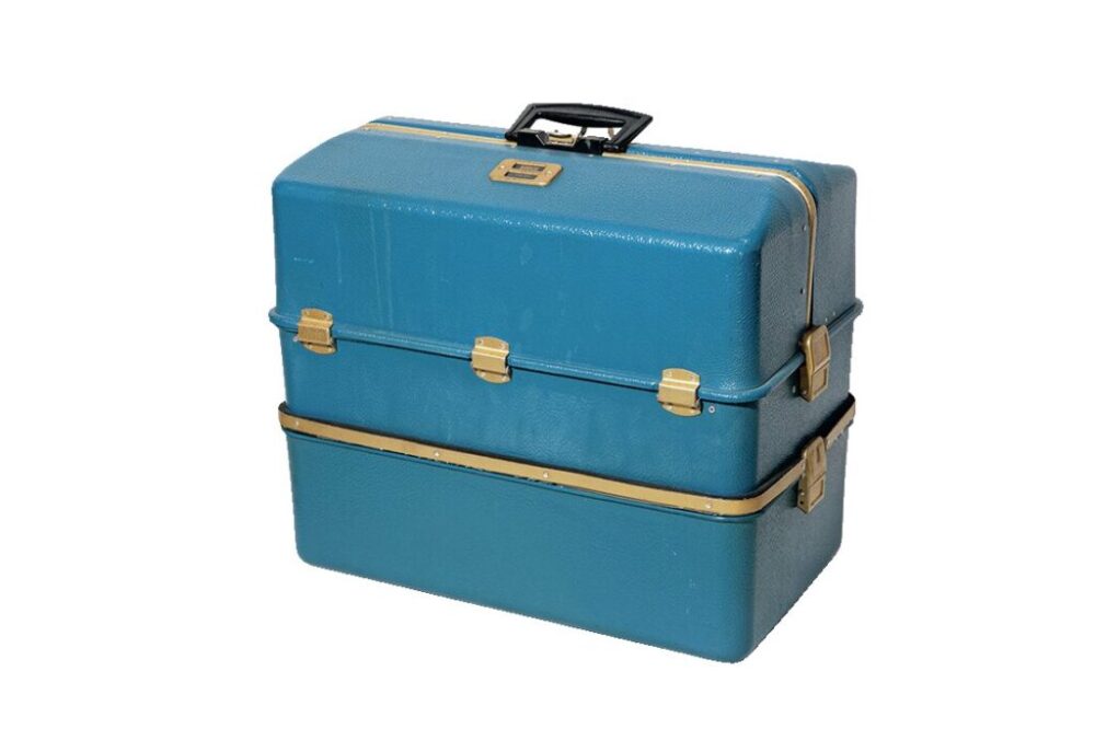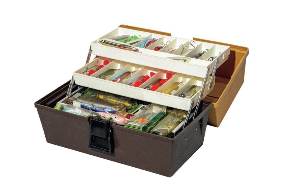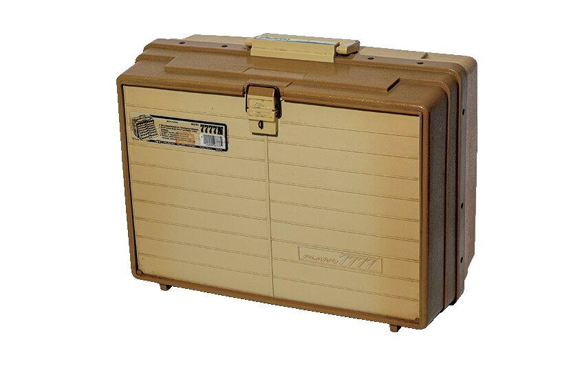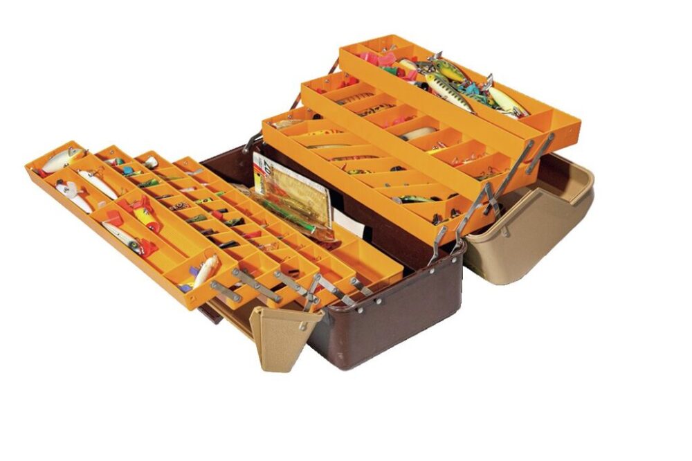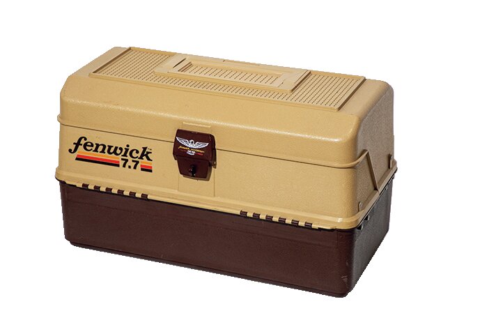 1970年代製。内部にひな壇式の3段の仕切りを備える。手頃なサイズ感で室内保管にも釣行にも使い勝手抜群。2万3000円