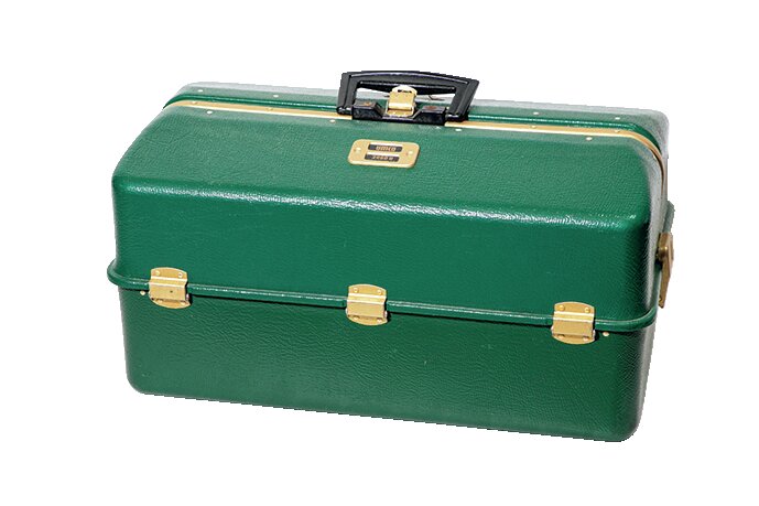 1920年代製。内部にはひな壇型の2段トレイが設置されている。蓋は3箇所でロックされる機構。室内保管用としてはもちろん、実際に釣行にも携行できる手頃なサイズ感。2万6000円