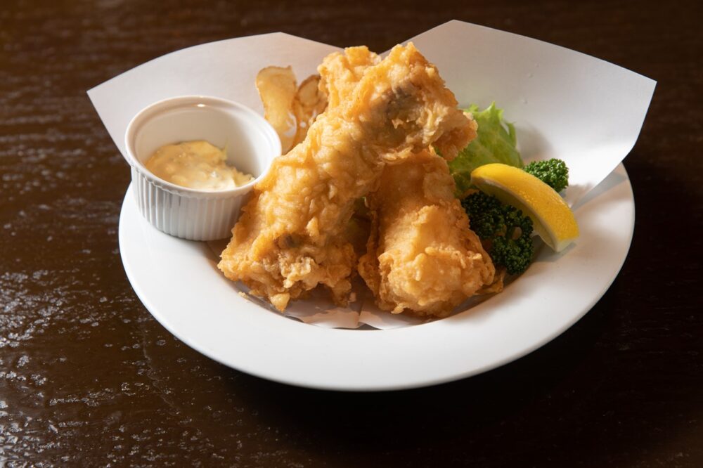ボリューム満点のフィッシュ&チップス。鱈を一晩IPAに漬け込んで旨みを引き出し揚げた。お手製のチップスとセットで。