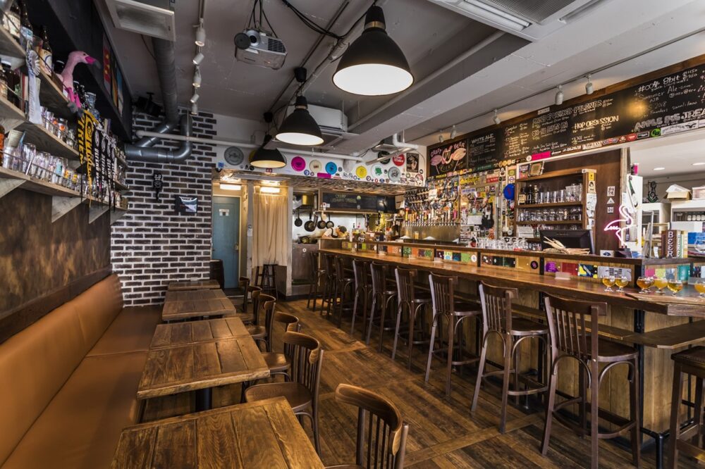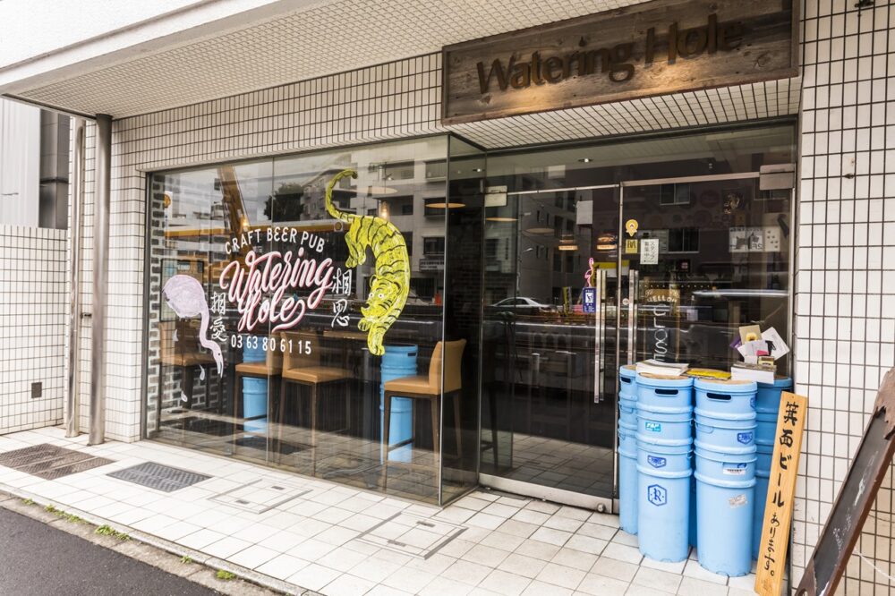 JR代々木駅から徒歩5分ほどの明治通り沿いにショップを構える「ウォータリングホール」。店内に入るとステッカーが大量に貼られた一角に設置された19個並んだタップが目に入る。明るい雰囲気の店内はカウンター12席を含めて全30席と広々している。