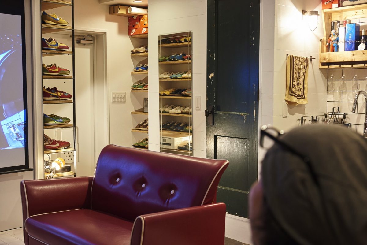 1996年のナイキショップの立ち上げをはじめ、数々のプロジェクトに携わり、現在はアグ®、ホカオネオネ®、テバ®などのブランド取り扱う、デッカーズジャパンに勤務する高見薫さんがこの家に引っ越してきたのは、今から約6年ほど前。その2階にはスニーカーのコレクションルームがあり、壁一面にぎっしり陳列されたスニーカーのコレクションは、主に高見さんが実際にセールスしていたモデルがその大半を占めている。スニーカーブームの黎明期を物語る希少なモデルなど総数は600足以上にも及び、資料性の高さから業界関係者の注目度が高い。