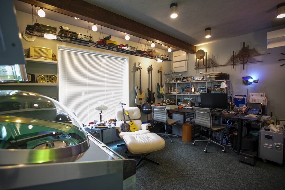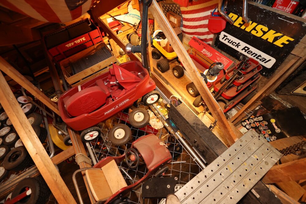 軽い気持ちで子供にラジオフライヤーを購入したら、すっかりハマってしまったと語るKYOさん。自宅がラジオフライヤーであふれるようになり、全部を収めるガレージを建てることに決定。しかし、空きスペースができたことから、収集欲がさらに増してしまったそう。そこでフランスのタイヤメーカー、ミシュランのマスコット「ビバンダム(ビブ)」のグッズを集めるようになった。こうして収集したヴィンテージ雑貨をガレージにちりばめ、居心地のよい空間を演出。趣味の仲間が集まる秘密基地のような存在になっている。