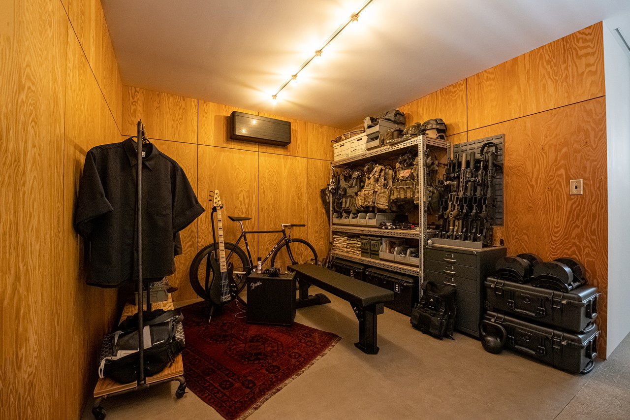 タクティカルギアブームを巻き起こした中野のミリタリーショップ、WARRIORSを運営するサトウ ノリカズさん。ミリタリーギアは手放すと2度と手に入らないものばかりで、自分がコレクションしたいもの以外にも仕事柄どうしても資料として取っておきたい物もあり、必然的に物が多くなってしまう。すでにコレクションをディスプレイできるキャパは超えていたため自宅建築の際にドアも収納スペースも何もない空間を作った。タクティカルギア以外は自分の好きな黒で揃えることでミリタリー過ぎない統一感を持たせた。