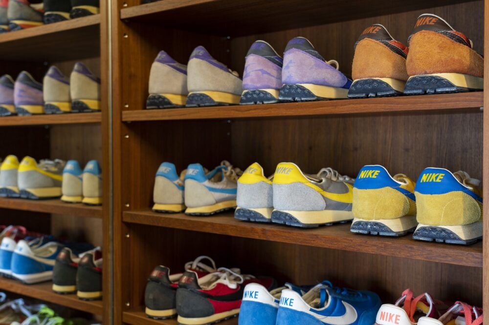Lightningから出ているムック本『ナイキ クロニクル』シリーズにおいて、その製作に尽力していただいたヴィンテージ愛好家の兼近さん。20代前半からリーバイスを軸に王道のヴィンテージウエアを集め始め、以降20年以上かけて集めたヴィンテージを買い続けてきた。そのコレクションは特別に扱うことなく、普通にクローゼットに収納し、日常的に愛用するのが兼近さんのスタイル。玄関脇に設置された棚には、数百足も所有するヴィンテージナイキのランニングシューズのうち、お気に入りの“一軍”を展示。SMUやプロトタイプなどレアな一点モノも多いが、デッドストック以外はほぼ全て着用した経験あり。