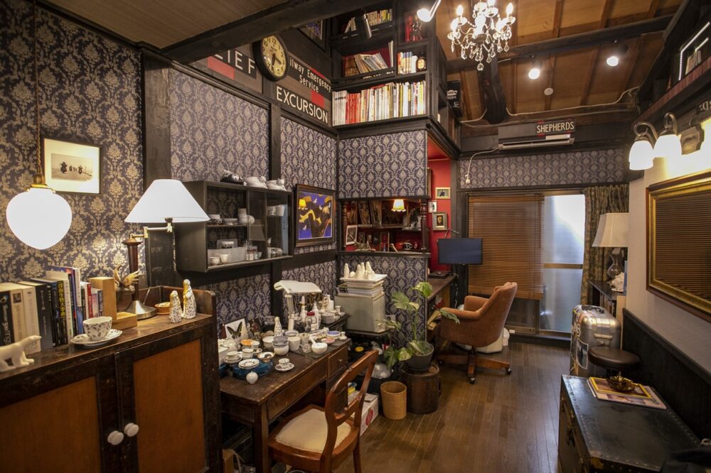 陶芸家の冨金原さんの京都の築95年の町屋を改装した自宅兼アトリエを訪れてみると、そこは外観からは想像も付かないイギリスの古いパブに迷い込んだような異国情緒溢れる空間が。柱と壁だけの状態から水回りなども含めて全て一人でこの空間を作った。しかも、図面などは一切書かないという。アトリエ一角のソファコーナー。後ろの壁にはイギリスのアーティストの写真。天井はヴィンテージの壁紙を使用するなど、「自分の納得のいく空間を作りたい」という情熱のみでプロも驚く空間を作り上げた。