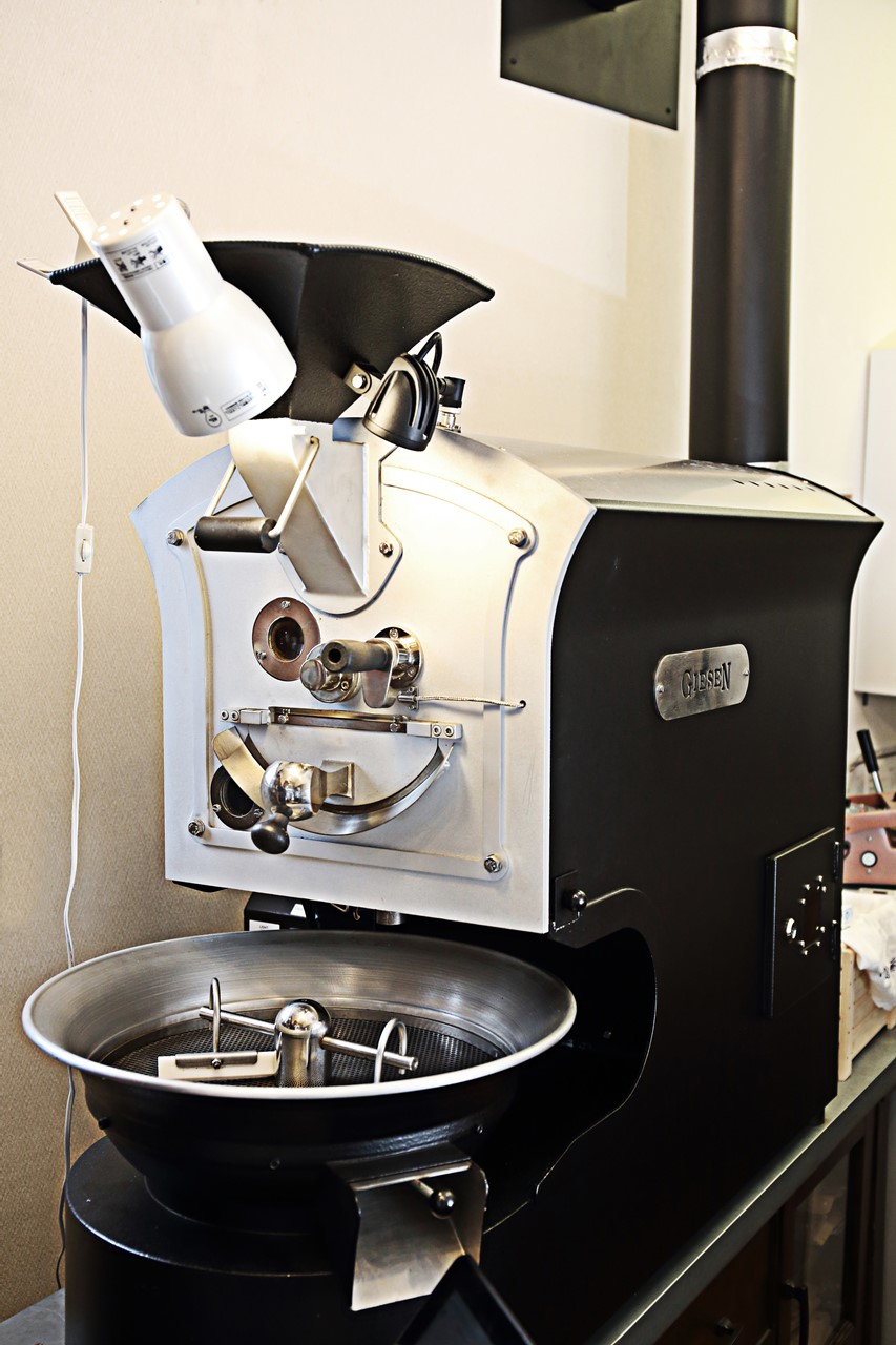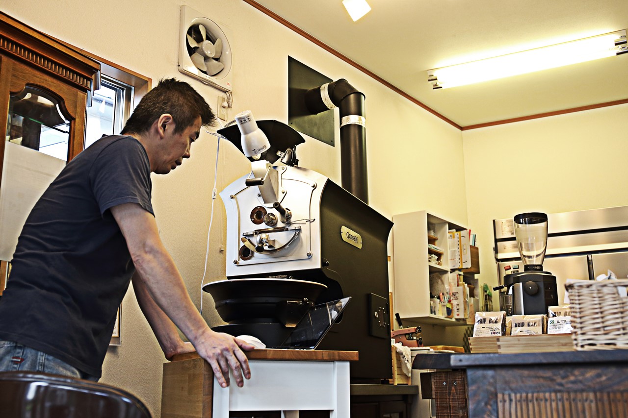 初期投資を抑えて、内装はシンプルに。焙煎機だけは惜しまずにお金をかけたが、それ以外は質の高いコーヒーをつくることに注力した。ダンパーを搭載したギーセンの焙煎機は、蓄熱性が高く余熱を活かした焙煎ができる。じっくり低温で焼き上げるのが杉峯さんのスタイルだ。