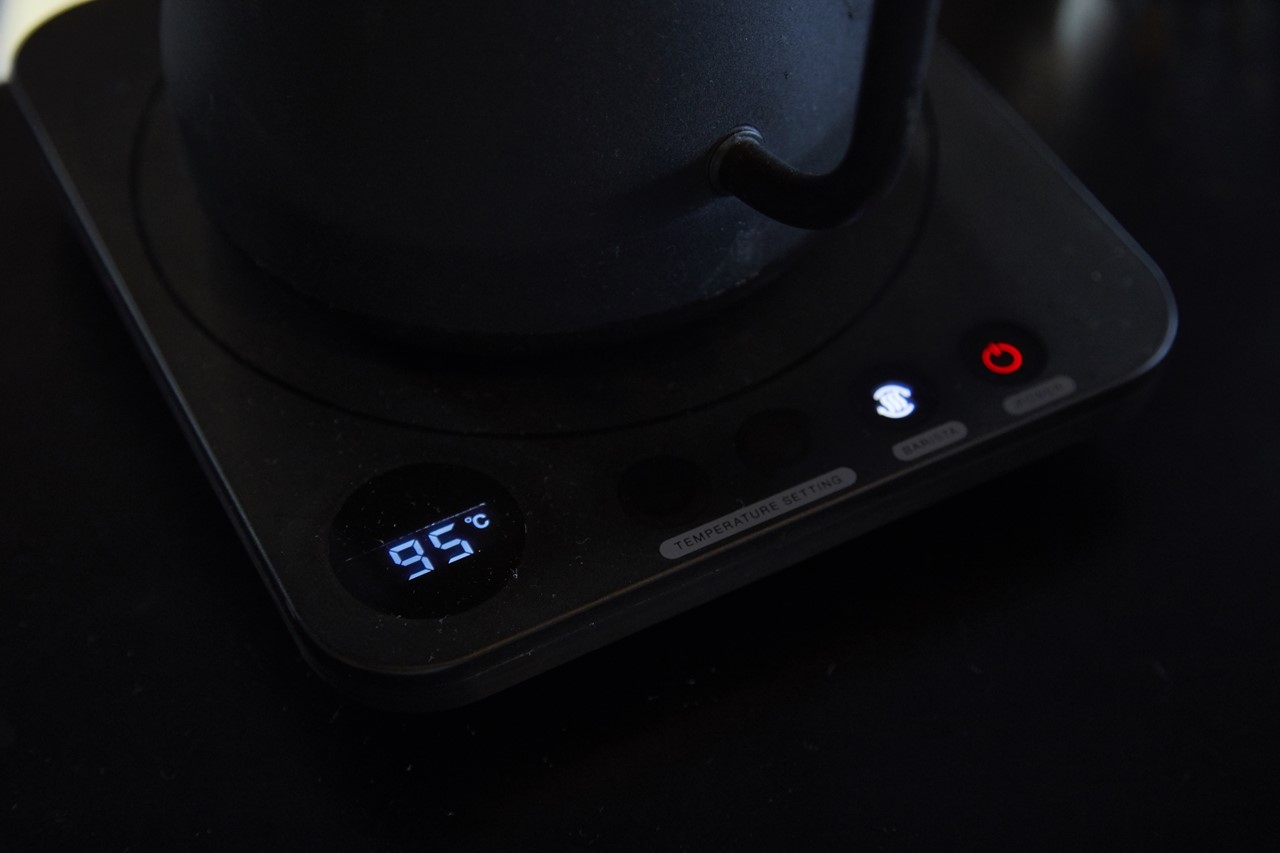 細口ノズルとハンドルの絶妙なバランスを備えたドリップケトル。専用の台にセットするだけで好みの温度を設定でき、そのまま30分保温が続く。