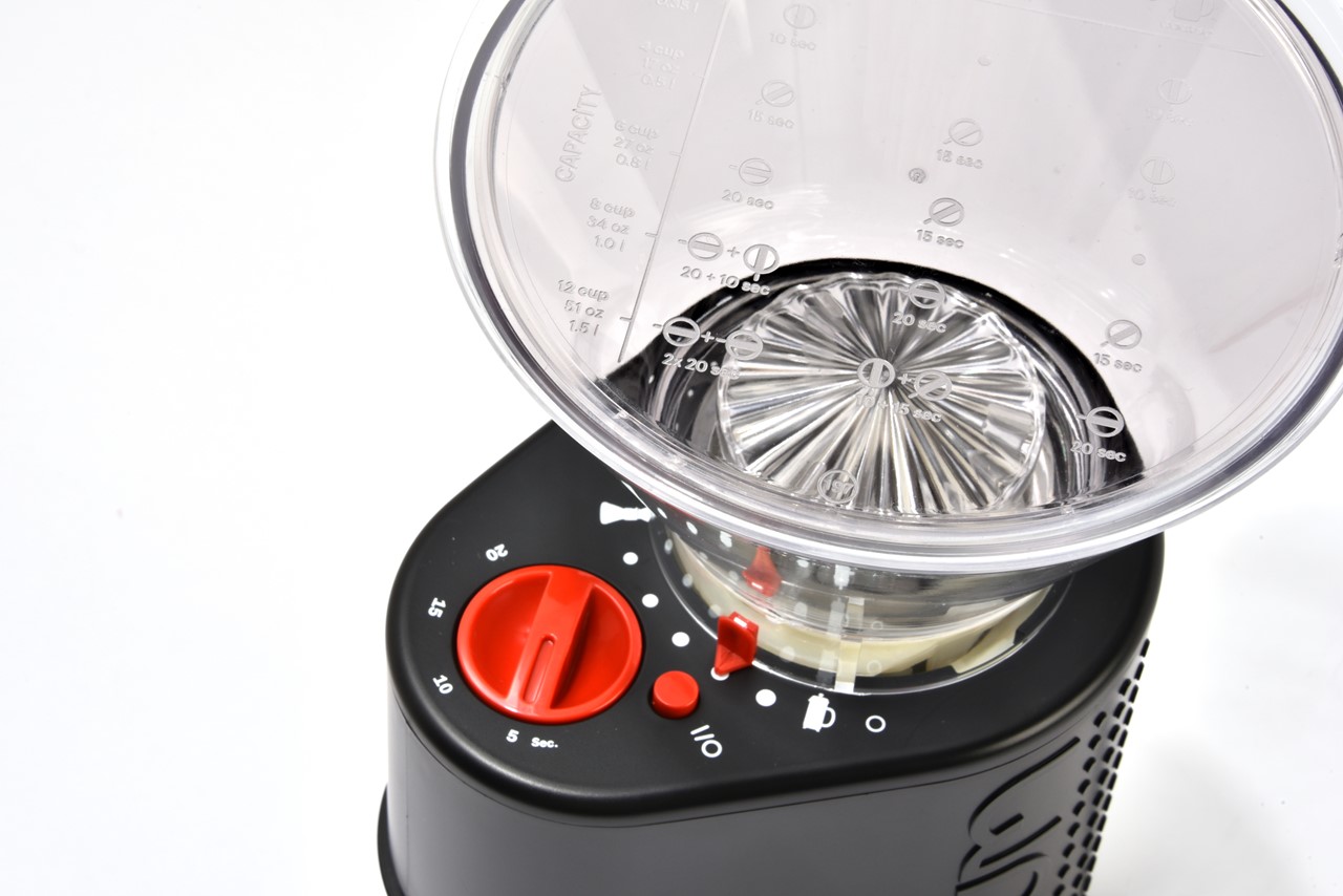 指でスイッチを押すだけの簡単操作。独特の形状が挽きムラを軽減するという中のボウルは取り外せるので、挽いた後も豆をこぼすことなくフィルターに移すことができる。(大石アンドアソシエイツ TEL03-5333-4447 http://russellhobbs.jp)