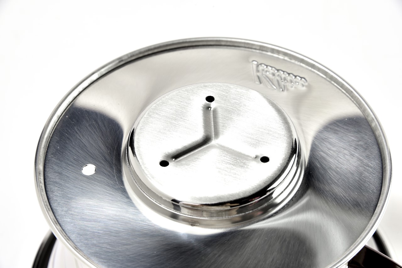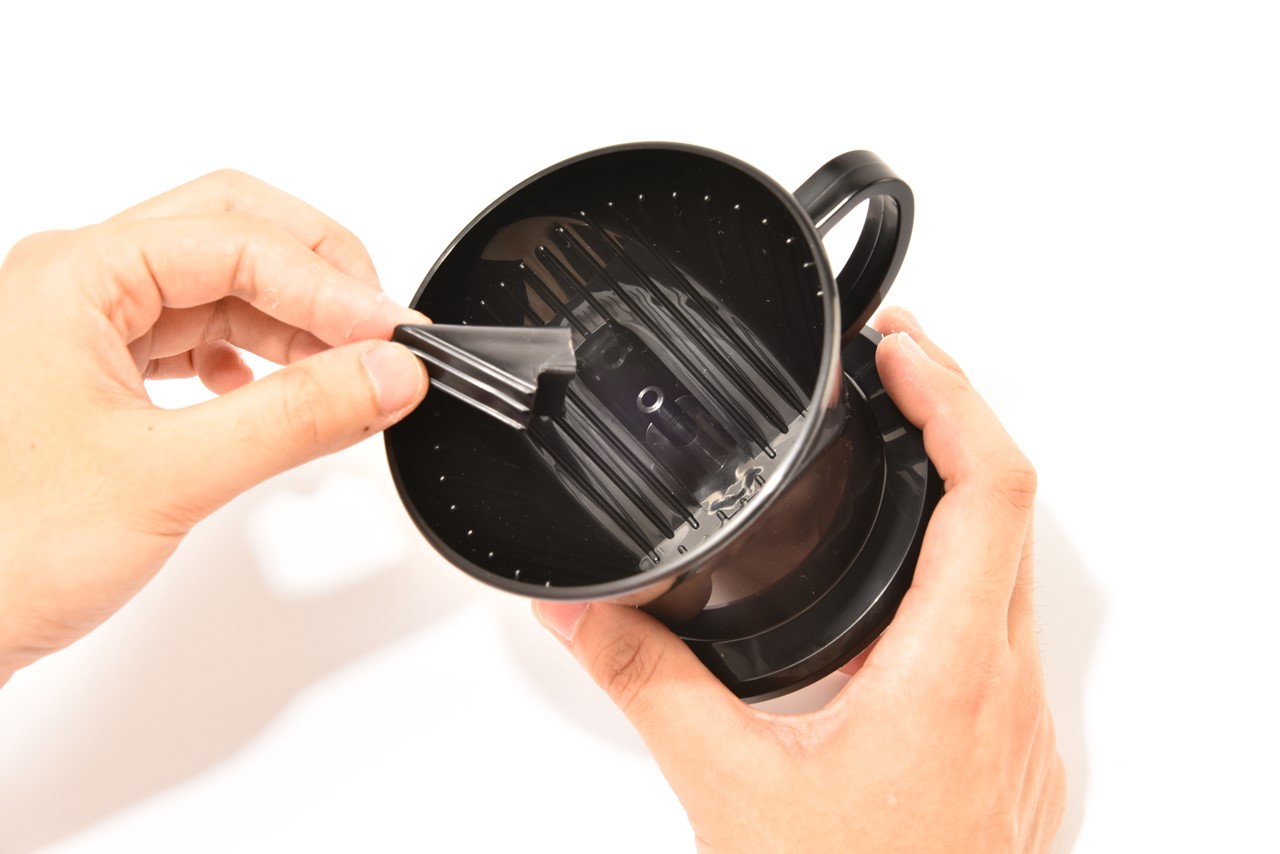 カリタ定番の底面の3つ穴ではなく、側面のひとつ穴から抽出する。下から突き出たパイプのおかででドリッパーに長く湯だまりができるためサイフォンのような風味になる。(カリタ TEL045-440-644 http://www.kalita.co.jp)