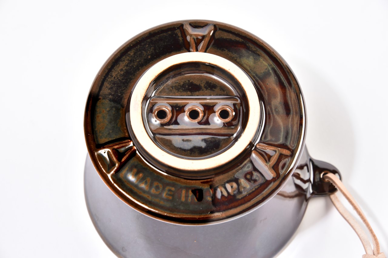 シンプルで定番的なフォルムに民芸の器でもよく使われる鉄釉を使用することで、ヴィンテージ感漂う雰囲気に。陶器製で匂い移りもなし。革紐のリング付きで収納も便利。(12amabro online store TEL03-5725-1210 http://www.amabro.com)