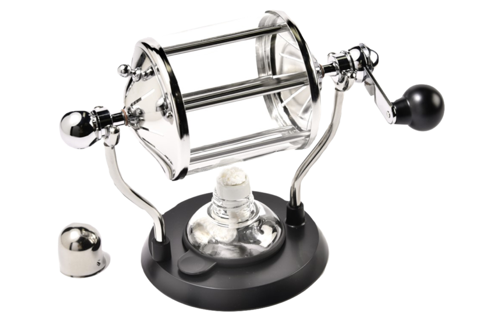 熱源にアルコールランプを使用することでデスクトップでも焙煎が楽しめるロースター。シリンダー部は耐熱ガラスで豆の焙煎具合を確認しながら行えるから失敗も少ない。(ハリオ TEL0120-398-207 https://www.hario.com)
