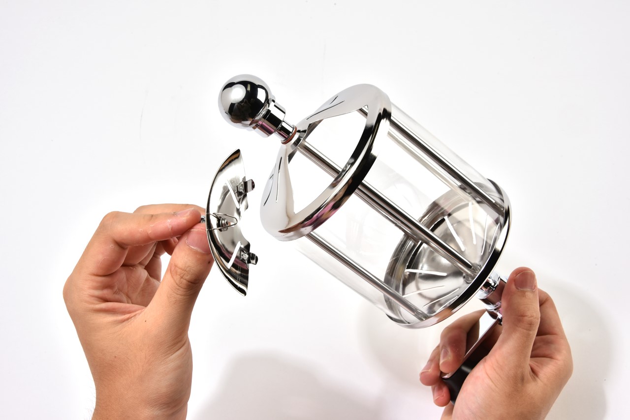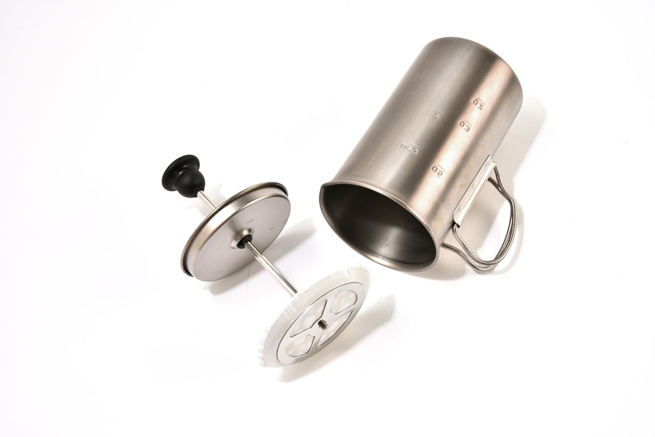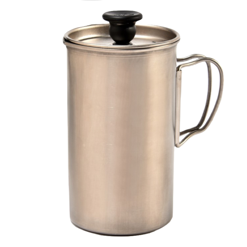 アウトドアや忙しい朝にいちいち人数分入れるのが手間なときに、手軽に香り高 いコーヒーが味わえるのがプレス式。チタン製だから直接火にかけることもできるスグレモノ。(スノーピーク TEL0120-010-660 https://ec.snowpeak.co.jp)