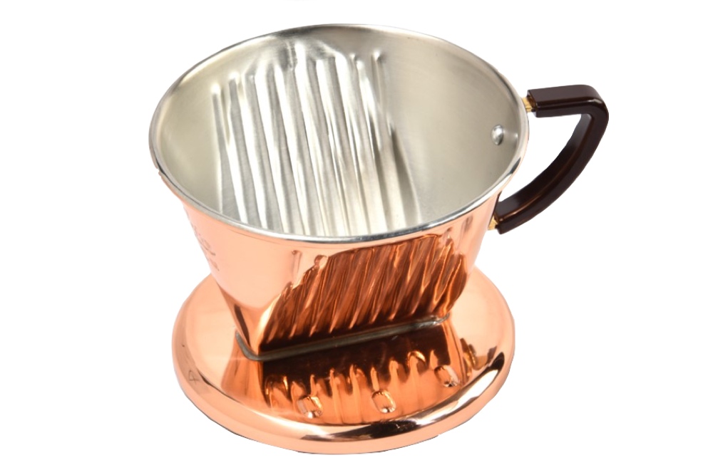 熱伝導率のよい銅を使用した高級感溢れる3つ穴式ドリッパー。持ち手には樹脂製のカバーが付けられているので使い勝手もいい。やはりこだわるなら使用感の高い銅製に限る。(カリタ TEL045-440-6444 http://www.kalita.co.jp)