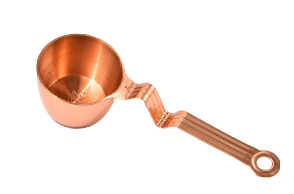 新潟県燕市の金属加工業社とコラボした銅製メジャーカップ。金属加工はもちろん、研磨職人が丹念に磨き上げた製品はこだわる人の所有欲を満たしてくれる。1杯約10g。(カリタ TEL045-440-6444 http://www.kalita.co.jp/)
