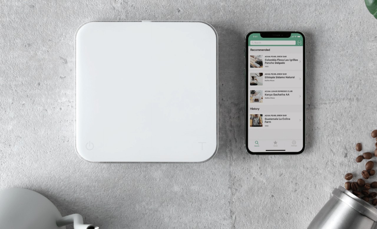 話題のIoT家電。0.1g~2kgまで0.1g単位で計量できるだけでなくスマホと連動し抽出のデータや状態をグラフ化。自分だけのレシピをSNSを通じて世界の人と共有できる。(FBC Int ernational TEL03-3436-2575 http://fbc-intl.co.jp)