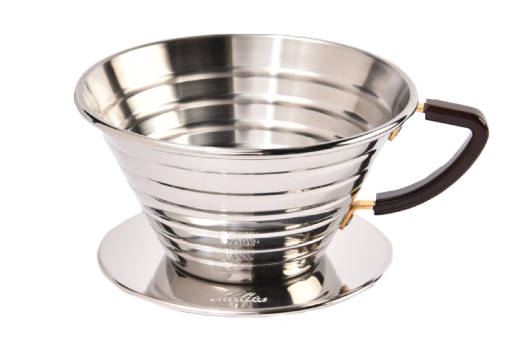 質感も美しいステンレス製。カリタのウェーブフィルター185(2~4人用)専用のドリッパー。独特の形状で長時間コーヒーがとどまらないのでスッキリした味が楽しめる。(カリタ TEL045-440-6444 http://www.kalita.co.jp)