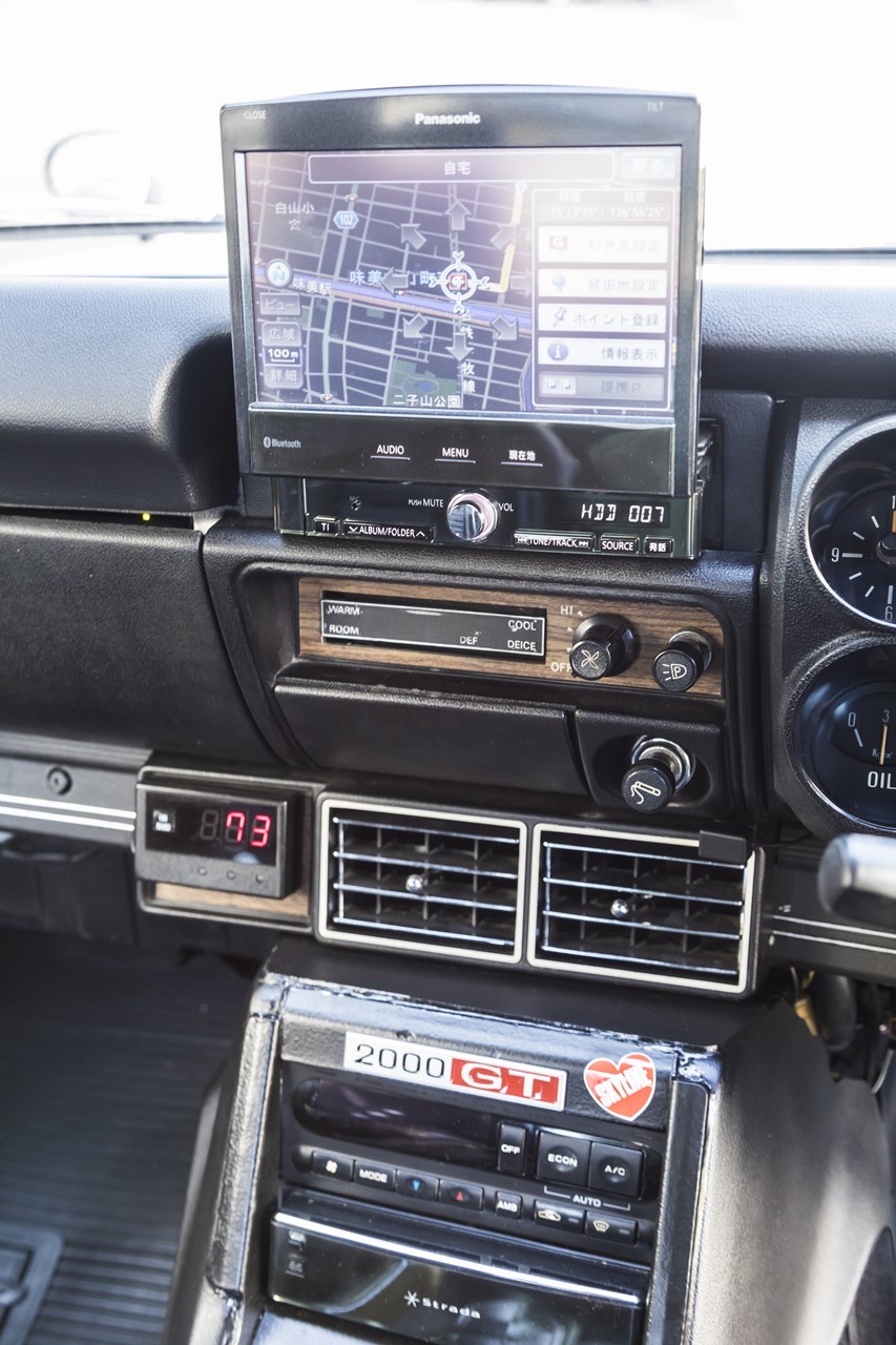 ダッシュにはナビを搭載するほか、純正のクーラー吹き出し口を使ってオートエアコンも完備する。吹き出し口の左側にあるのはデジタル水温計だ。