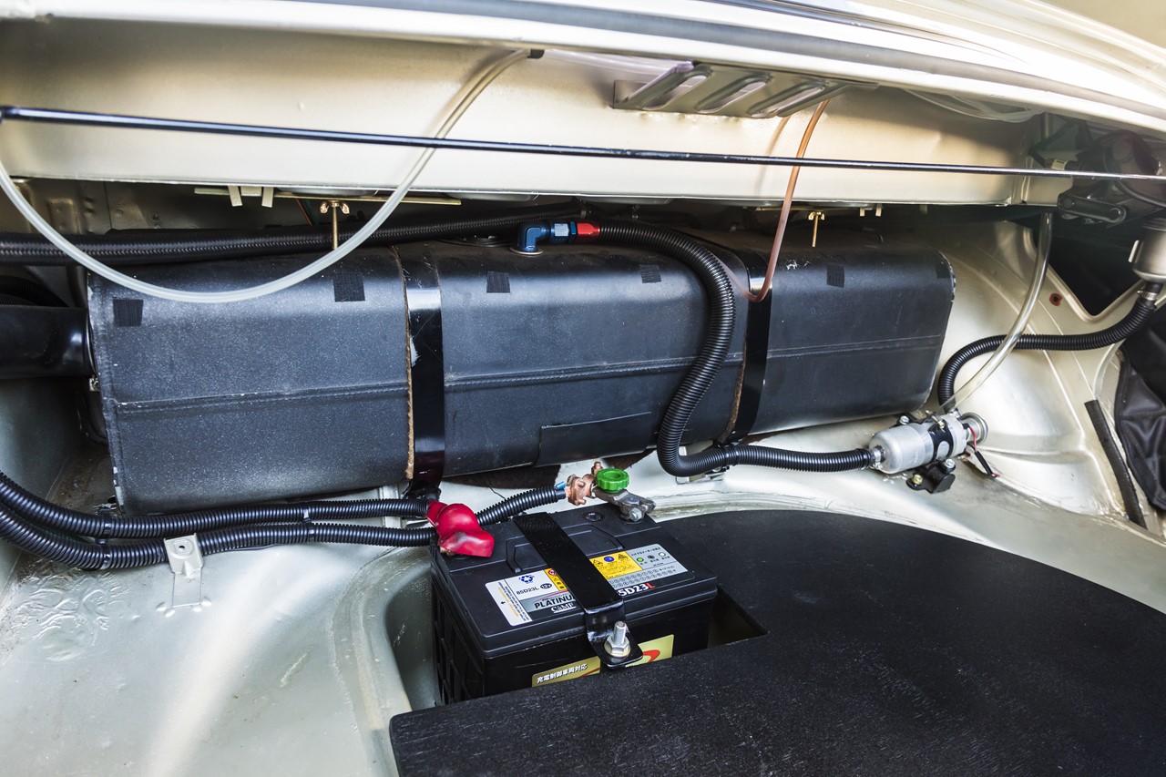 マットを外すとガソリンタンクやバッテリー、インジェクション用の燃料ポンプなどが見える。