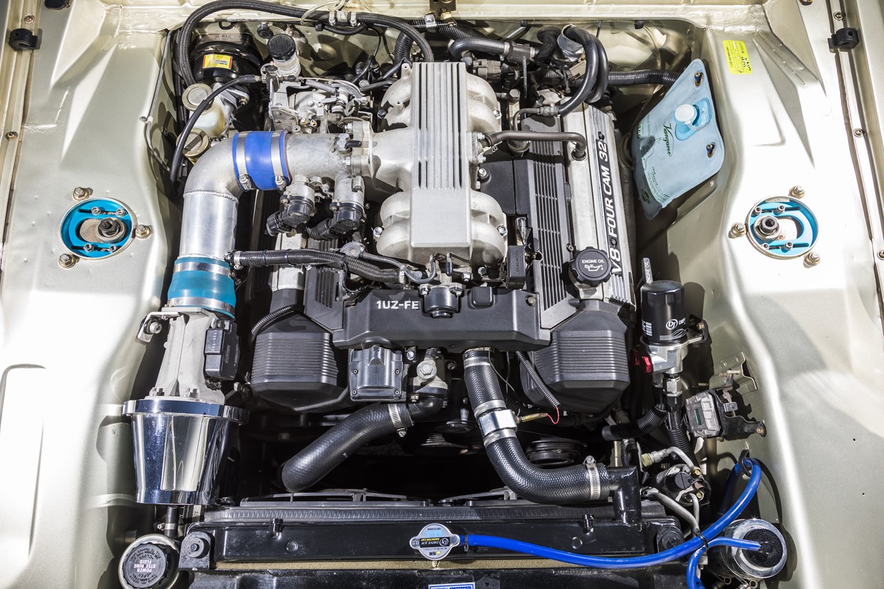 エンジンルームに収まる1UZ型4リッターV8エンジンは280馬力を発生。実は6気筒より2気筒分短いため、重心は後方に移動しており、フロント荷重は軽減されている。