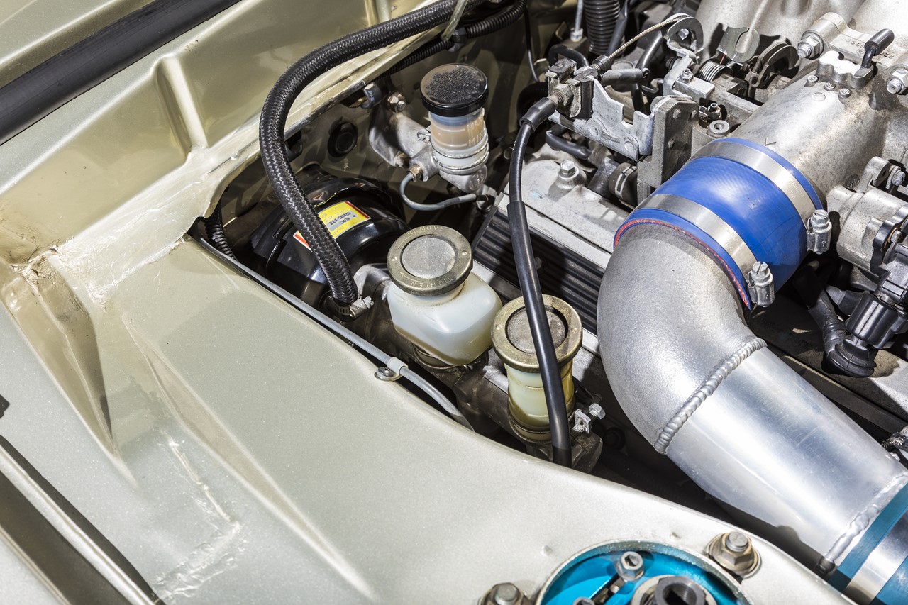 V型エンジンの搭載を想定していないため、エンジンルームは手の入る隙間もない。マスターシリンダーとインテークパイプのクリアランスもご覧のとおり。
