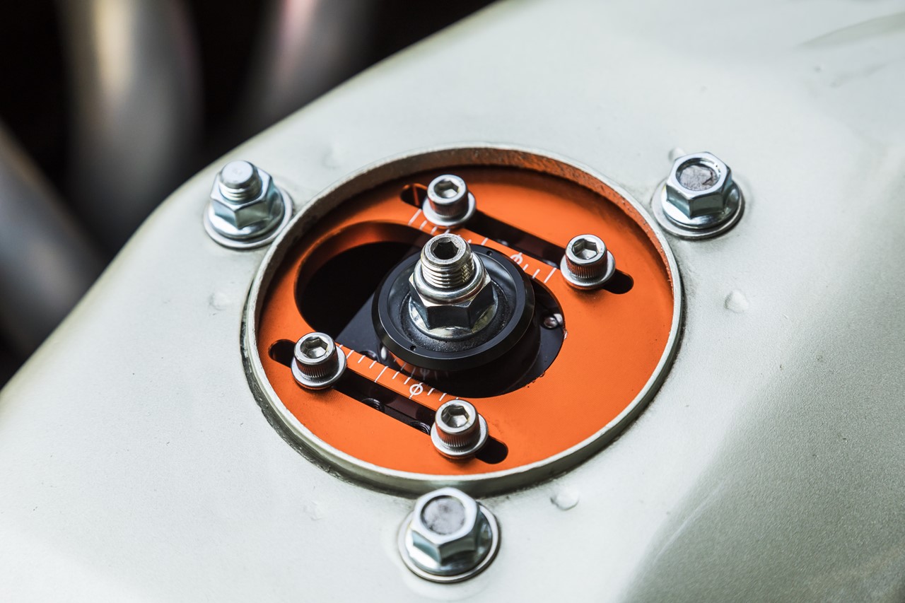 フロントはピロアッパー付きのフルタップ車高調を装着。適度にロワードされ、乗り心地もいい。
