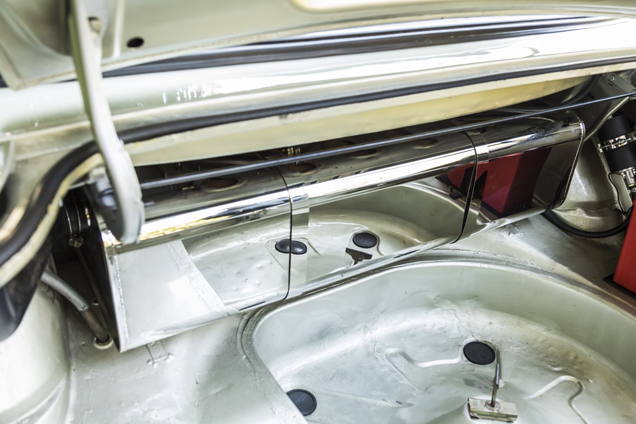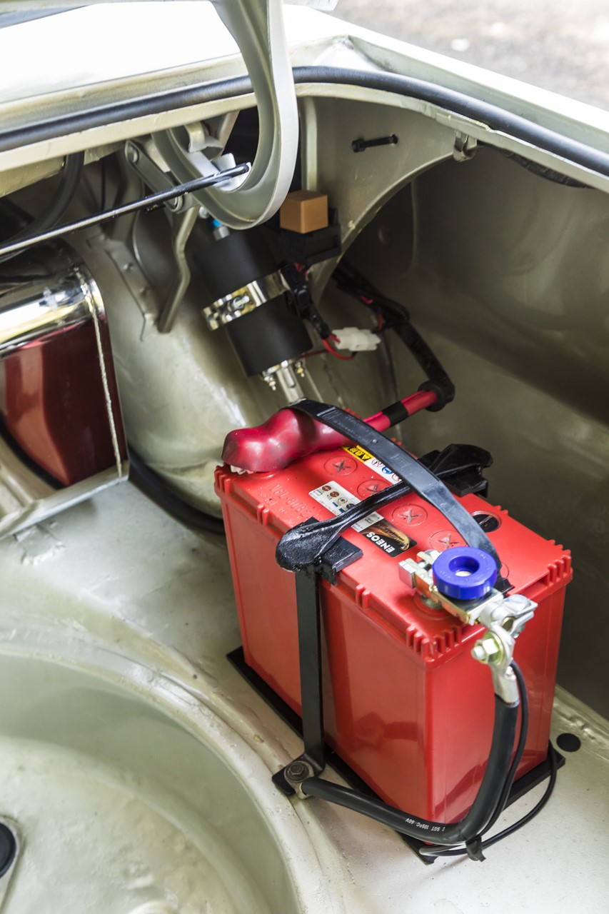 バッテリーはエンジンルームからリアのトランクに移設。その後ろにはインジェクション用に追加されたアウトタンク燃料ポンプなのだ。
