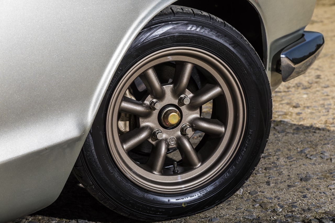 ボディは’70年式の2000GTをベースに、リアフェンダーをR仕様にしていた個体。テールはこの年のみとなる通称「45テール」だが、フロント周りは3分割が特徴の通称「44グリル」をあえてチョイスしたいいとこ取り仕様。さらに前後ともにGT–Rエンブレムが備わらない独特のスタイルとなっている。