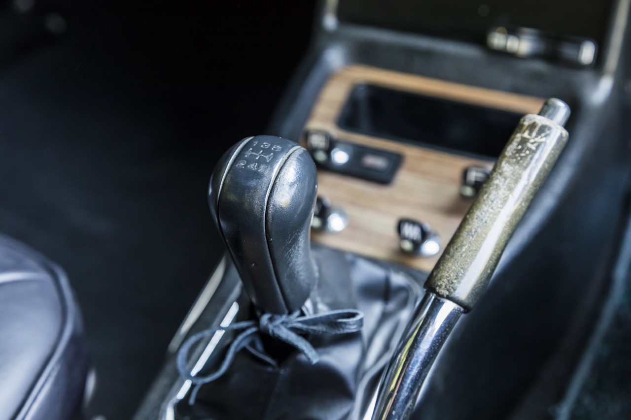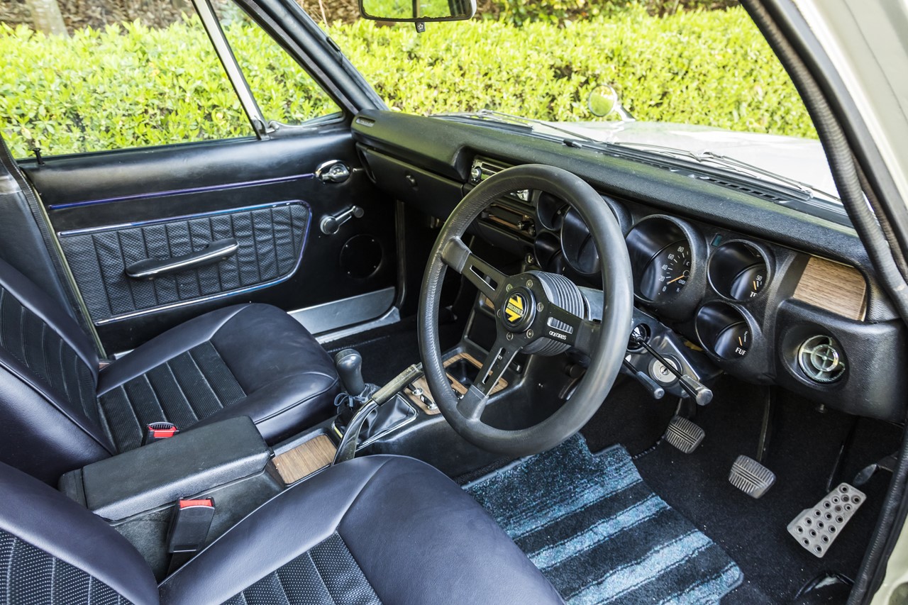 シートは4ドアGT系の純正ローバックタイプ。トランスミッションはスカイライン用の日産71C型5速マニュアルを移植している。シフトレバーはR32スカイライン用を使用している。