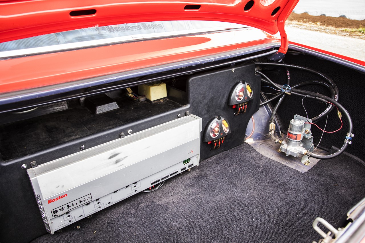 トランク内にはガソリンタンク手前に巨大なアンプを設置。右側に見えるのは燃料用電磁ポンプ。