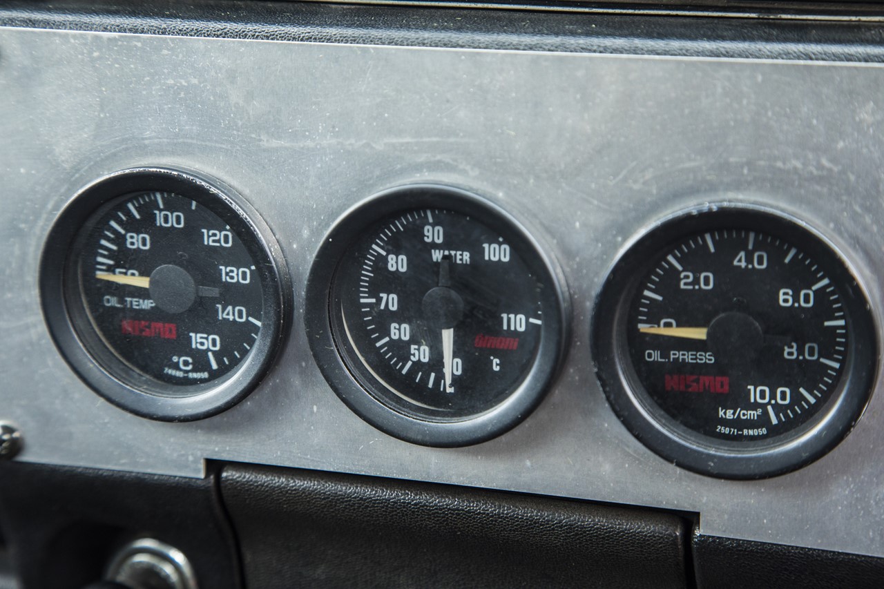 ダッシュセンターにはアルミ板を装着し、右からNISMOの油圧、大森の水温、NISMOの油温の各ゲージを装着する。