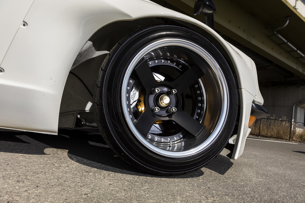 次に増加したパワーをしっかり受け止めて路面に伝えるべく、ホイール&タイヤは、かなりワイドなものを選んでいる。ホイールはオーナーがスペシャルオーダーで製作したというオリジナルデザインで、フロント16×9.5J、リア17×12Jという前後異径の極太リムをにしている。これにアドバンネオバを前後に装着する。