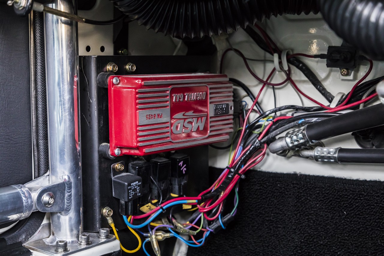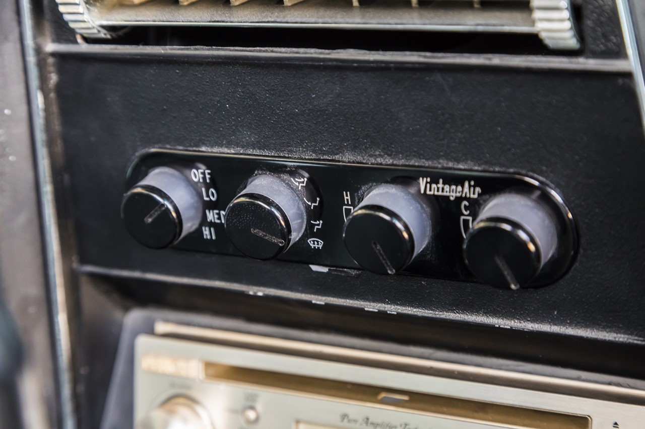 エアコンは、アメリカヴィンテージエアー社製のユニットを使ってコンパクトにマウント。ダッシュ中央にビレットの操作スイッチが備わる。