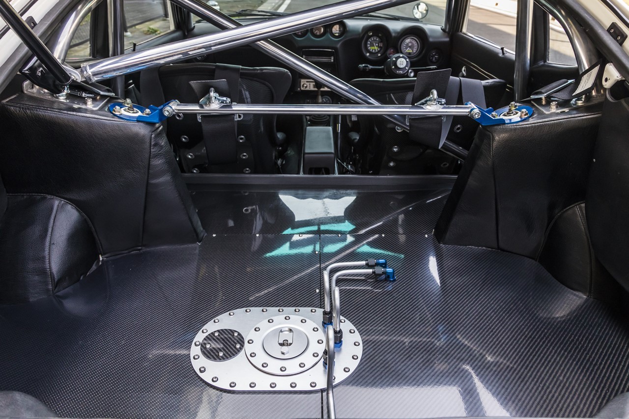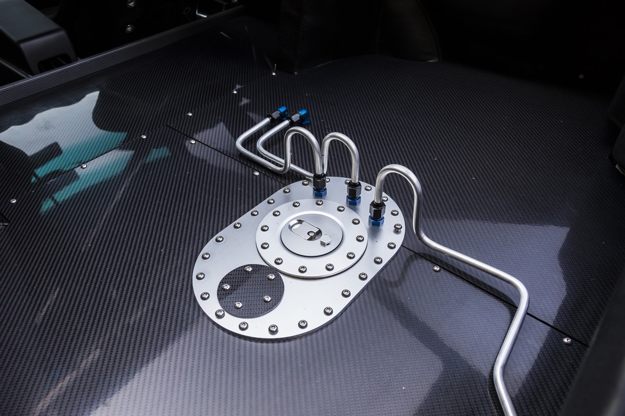 ラゲッジスペースはカーボンパネルで覆われ、その下には安全タンクを装着。綺麗に並んで配置されたアルミパイプの配管が美しい。