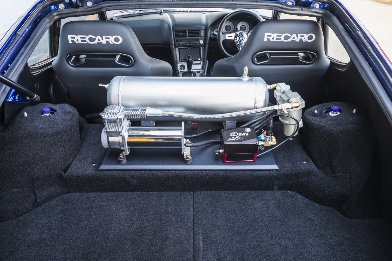 シート後部にはエアサス用のコンプレッサーやエアタンク、コントロールバルブなどがコンパクトに設置される。
