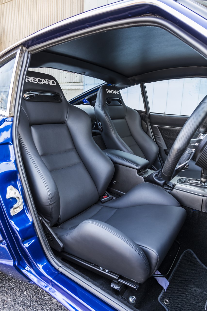 シートはレカロのSRをチョイス。当然だがR34用のレカロ用シートレールを使用して装着。かなり低い位置にマウ ントされているため、ヘッドスペースも確保されている。