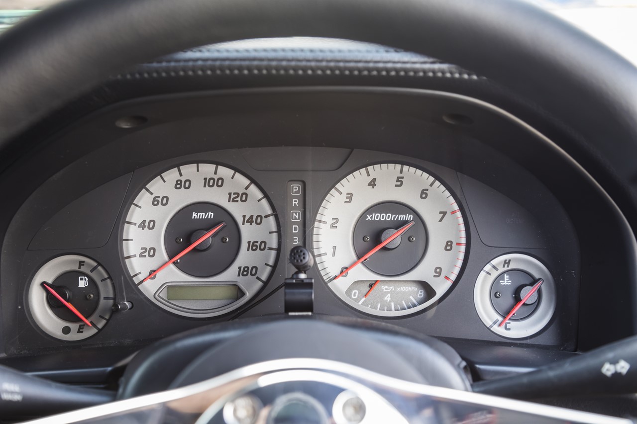 メーター周りもR34のまま。7000rpmからレッドゾーンのエンジンを堪能でき、その気になればメーターを振り切る実力をもつ。