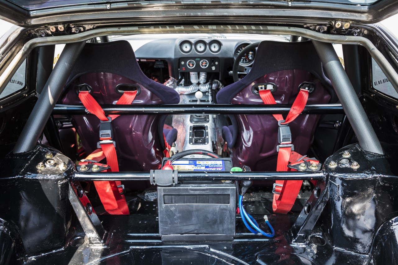 車内にはロールバーがセットされているだけでなく、リア左右のストラットタワーは、シートベルトアンカーを兼ねた補強のバーで接続し、強化されている。