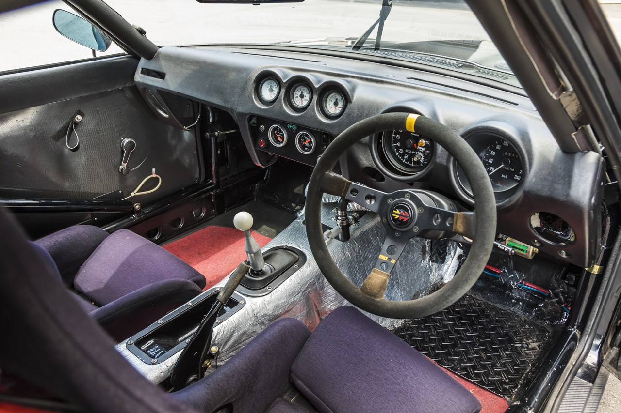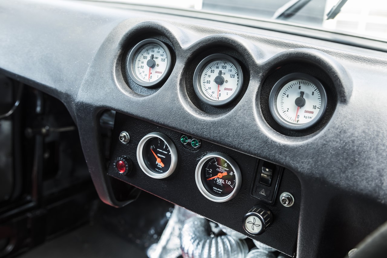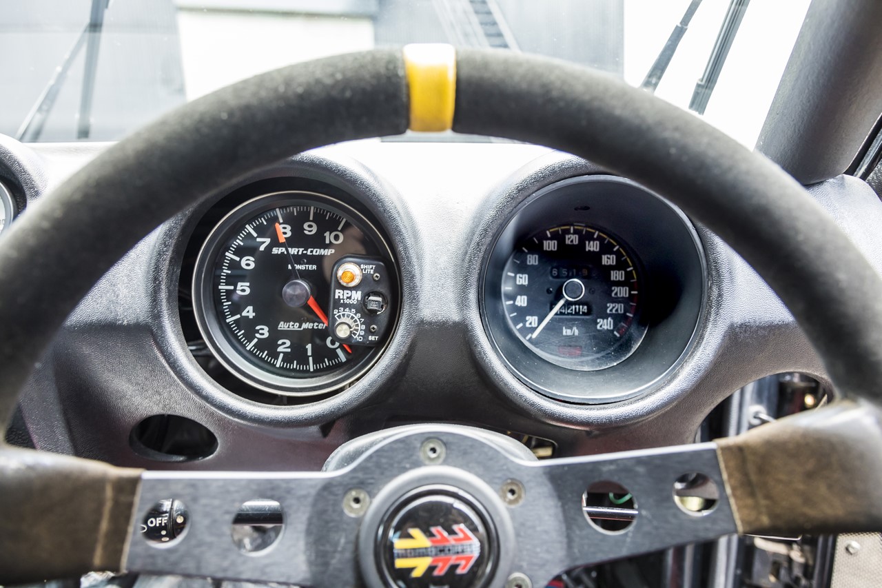 非常に軽量なFRP製のダッシュにはロールバーが貫通している。またドアパネルもカーボン製の簡素な作りとなっている。
