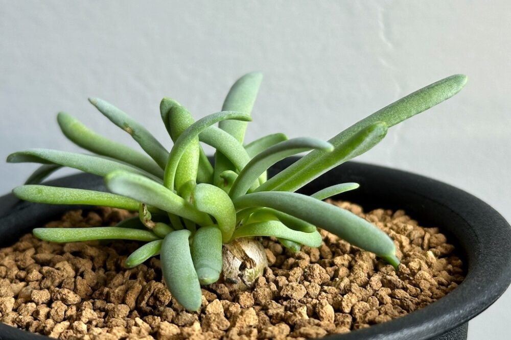 現地では、塊根部分がほとんど地中に埋まった状態で自生しているオトンナ・ハリー。こちらは国内で種から育成された1年半ほどの実生株です。
