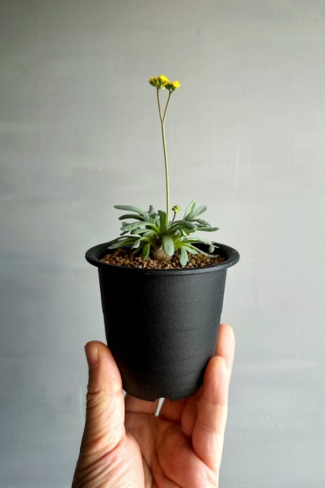 生育期に咲く黄色く可憐な花も、キク科の植物であるオトンナ属にみられる特徴です。小さな塊根もほとんど地中に埋まり、枝を伸ばすこともないハリーですが、真上に伸びる花芽は同じオトンナ属の中でも長めです。
